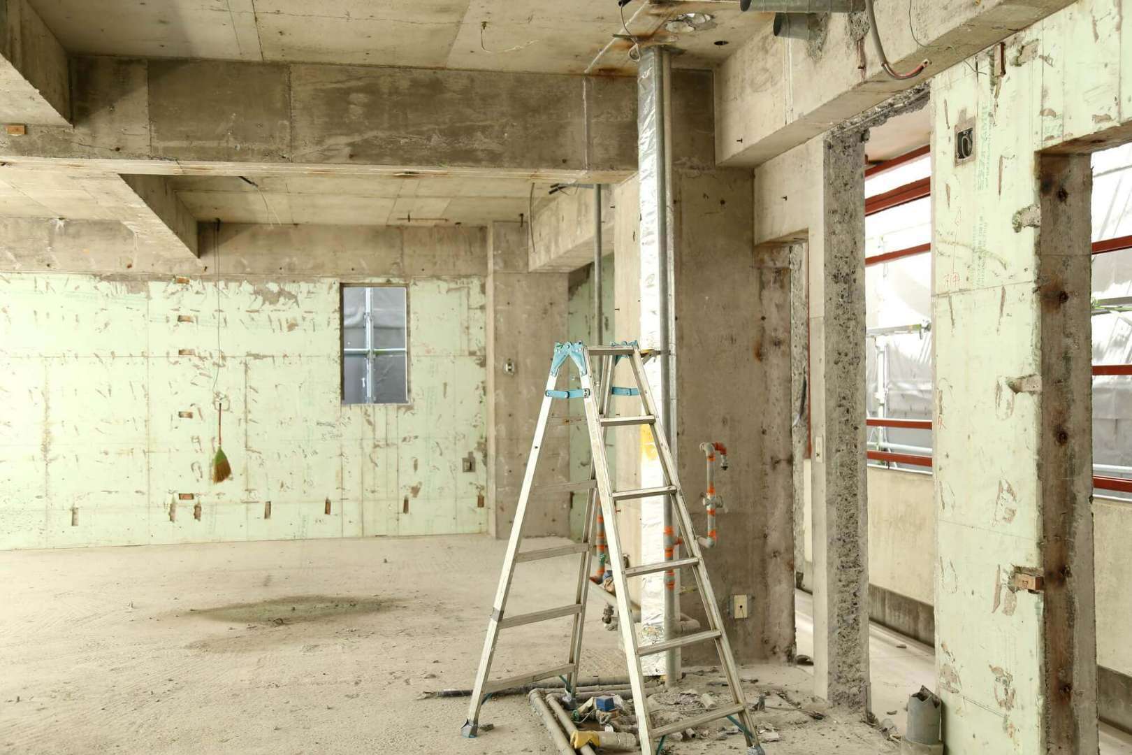スケルトン工事とは、内装や設備をすべて解体・撤去し、建物の骨組み(躯体)が剥き出しの状態に戻す工事です。コンクリート打ちっぱなしの状態をイメージすると分かりやすいでしょう。