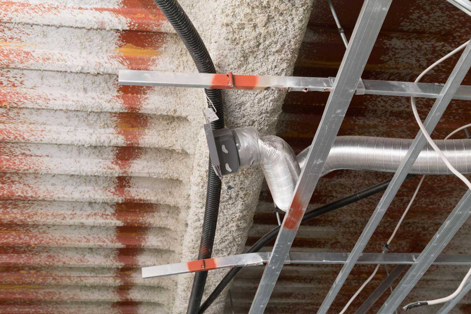 また、吹付けで連続的に施工できるため、広い面積でも効率よく工事を進められるのも、メリットの一つ。物流施設やオフィスビルのように施工範囲が大きい建物では、工期と費用のバランスがとりやすい工法です。