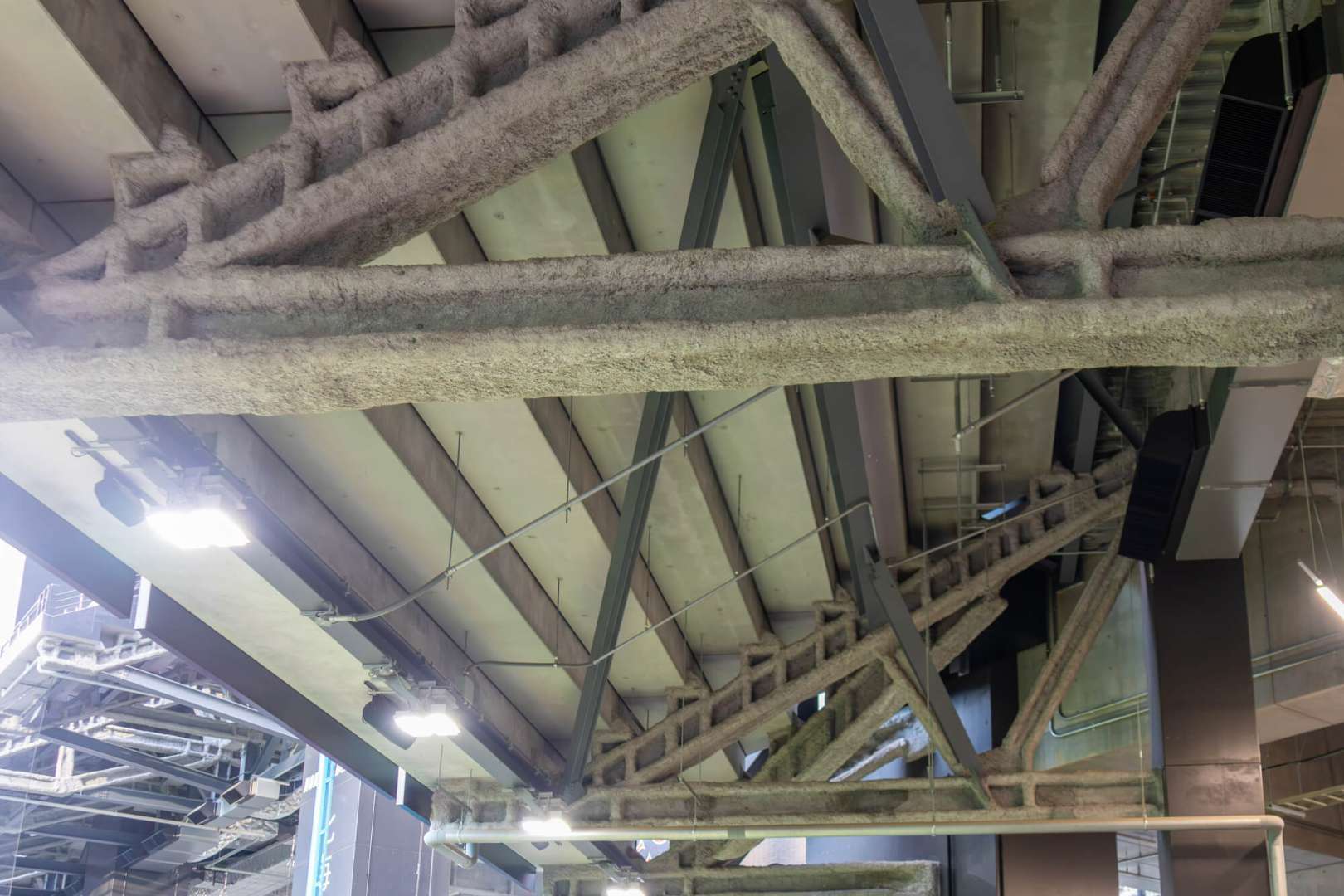 耐火被覆工事では、鉄骨の構造や建物の用途によって施工の難易度が大きく変わります。たとえば物流施設や大型商業施設などの鉄骨造建物では、梁や柱が複雑に組み合わされているケースも多く、施工範囲だけでなく工程管理も複雑になります。