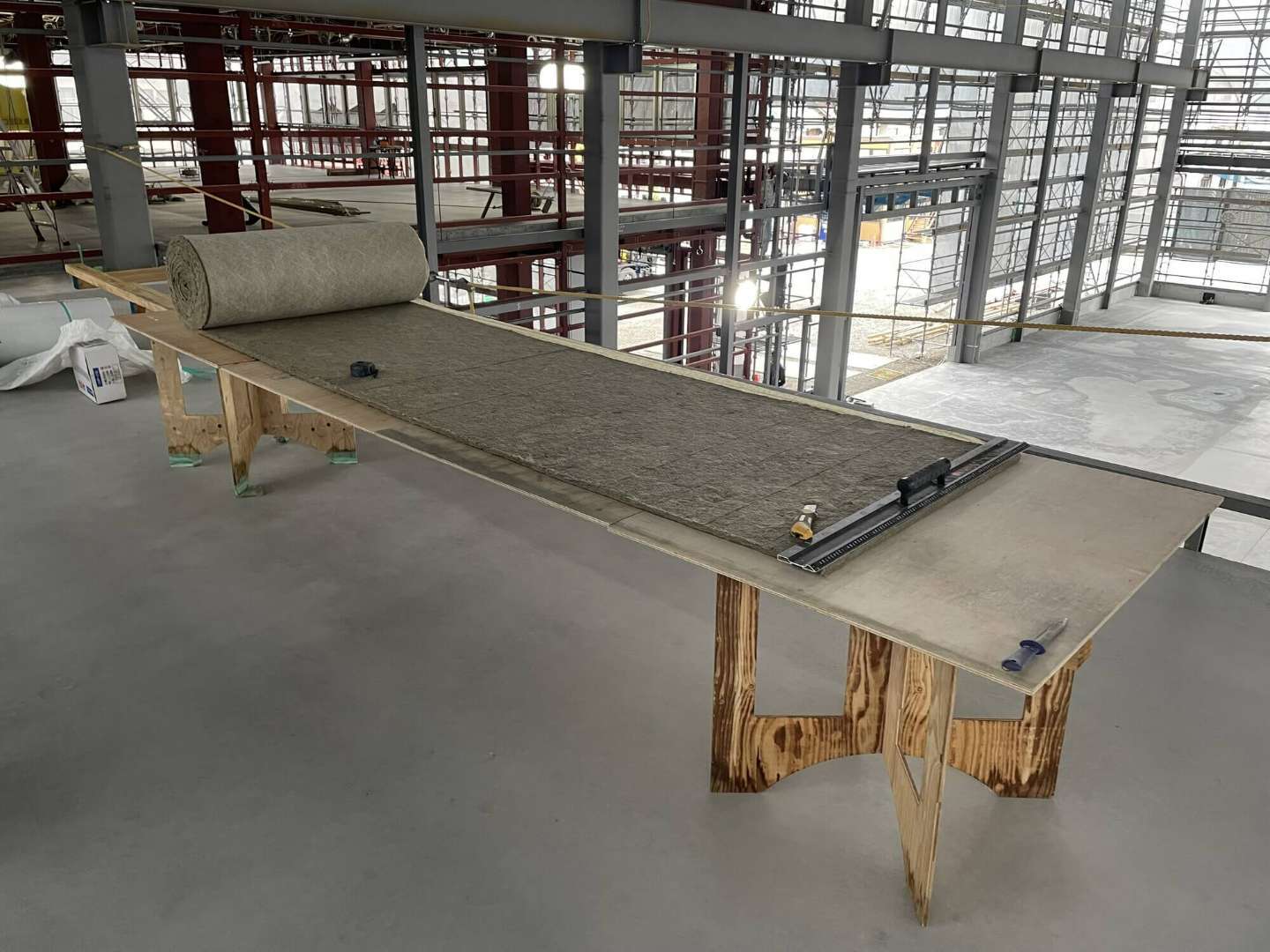 マキベエは、耐火被覆材をシート状に加工し、鉄骨に巻き付けて固定するタイプの工法です。材料自体は扱いやすく、従来の吹付け工法と比べて粉塵が少ないため、安定した品質を確保しやすい点が特徴とされています。
